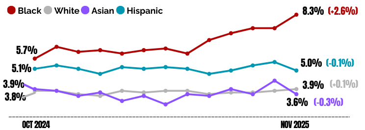 Black workers are the only racial and ethnic group to see their unemployment rate spike since Trump won the November 2024 election. The latest monthly jobs report shows Black unemployment nearly 1.5 times higher than it was before the 2024 election. The rate rose from 5.7% in October 2024 to 8.3% in November 2025 – a level not seen since the pandemic.