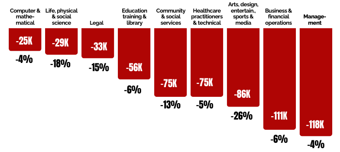 A drill down into subcategories of management and professional jobs shows several groups that lost one-tenth or more of their Black workforce over the past year. The most drastic case is arts, design, entertainment, sports, and media, which lost over one-quarter of its Black workforce (26%). The next biggest hit was in life, physical, and social sciences, where the Black workforce shrank by 18%, followed by legal occupations and community and social service jobs, which lost 15% and 13% of Black workers, respectively.