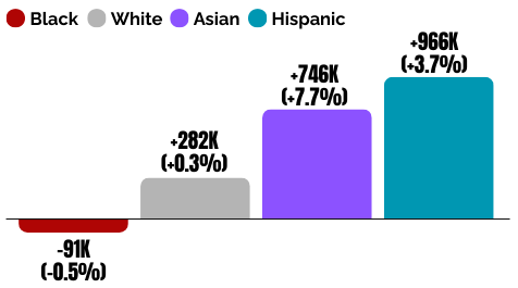 Meanwhile, unemployment has changed little for other groups. The rate rose by one-tenth of 1% for white Americans, and fell modestly for Asian workers (-0.3%) and Hispanics (-0.1%).