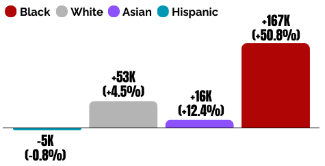 By sharp contrast, other racial and ethnic groups experienced growth in their management and professional workforce, ranging from 1% for white Americans to 13% for Hispanic Americans.
