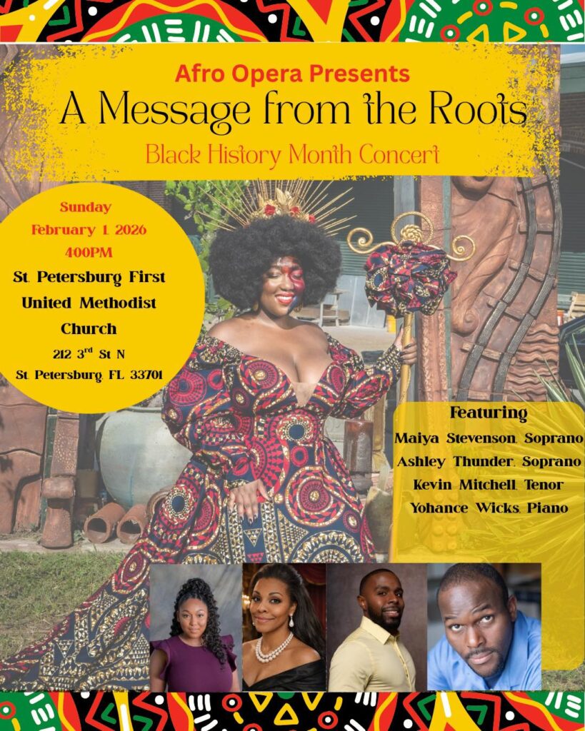 Start February on a high note with Afro Opera’s third annual Black History Month Concert, “A Message From the Roots” – a free event at St. Petersburg First United Methodist Church on February 1st, at 4 PM.