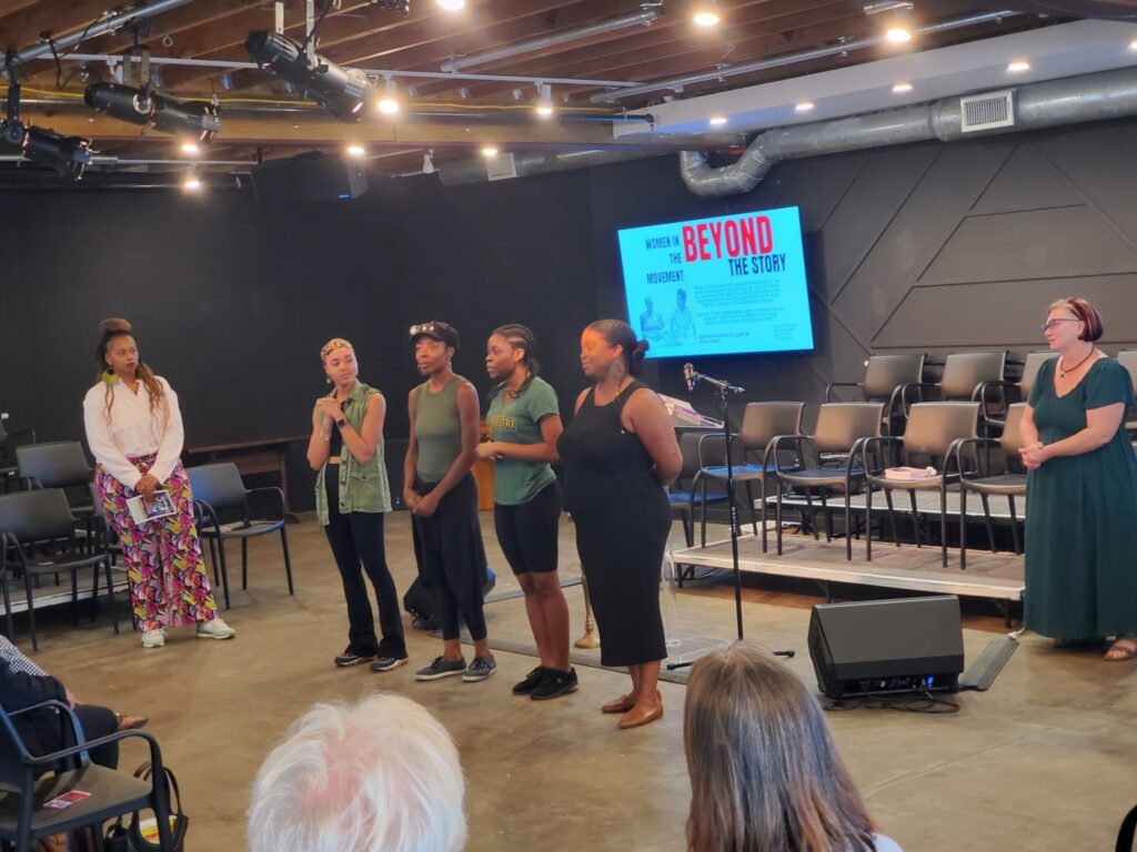 Erica Sutherlin, far left, Cadillac Crew Cast, and Powerstories executive director Clareann Despain, far right. Image courtesy of Powerstories Theatre.