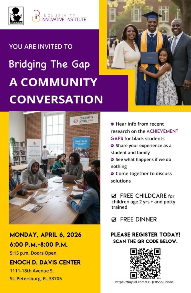Join the conversation at Bridging the Gap, a community discussion focused on the barriers impacting Black students and the path toward stronger outcomes. The event will be held on Monday, April 6, from 6 to 8 p.m. at the Enoch D. Davis Center, 1111 18th Ave. S., St. Petersburg, FL 33705. Dinner will be provided, and childcare will be available for children ages 2 and older who are independently using the restroom.