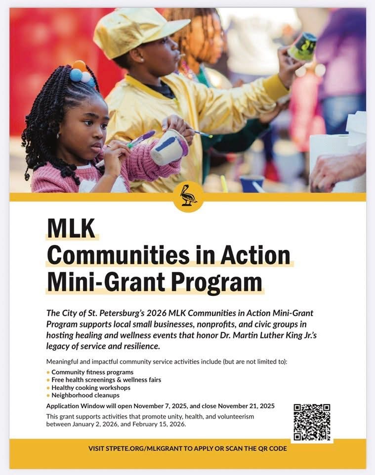 The City of St. Petersburg’s 2026 MLK Communities in Action Mini-Grant Program is an initiative aimed at fostering community healing, wellness, and service in honor of Dr. Martin Luther King Jr.’s legacy. This grant opportunity is available to small businesses, nonprofits, and community-based organizations registered in Florida, supporting activities that promote unity, health, and volunteerism between January 2, 2026, and February 15, 2026. Eligible projects must align with one of four focus areas: Arts and Culture Events, Community Support Services, Environmental Activities, or Health and Wellness Activities. Click here to apply today.