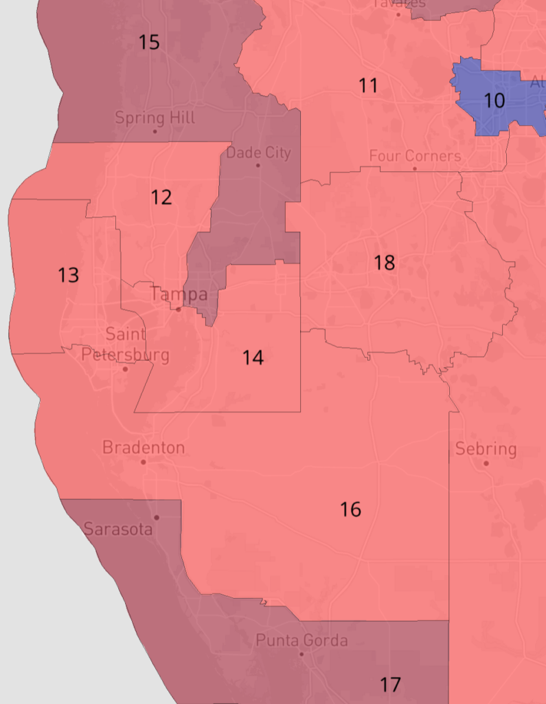 A close up view of how redistricting affects Tampa Bay. Image: Screengrab, davesredistricting.org