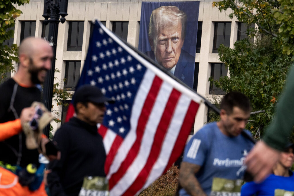UNITED STATES – OCTOBER 26: A President Donald Trump banner is seen on the Department of Labor building as runners make their way down Pennsylvania Avenue during the 50th Marine Corps Marathon on Sunday, October 26, 2025. (Tom Williams/CQ-Roll Call, Inc via Getty Images)