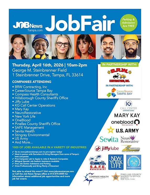 Employers: BRW Contracting Inc., CareerSource Tampa Bay, Compass Health Consultants, Hillsborough County Sheriff’s Office, Jiffy Lube, KG Call Center Operations, Mary Kay, NeuroRestorative, New York Life, OneBlood, Pinellas County Sheriff’s Office, SAFE Management, Sevita Health, Stingray Environmental, US Army, and more…