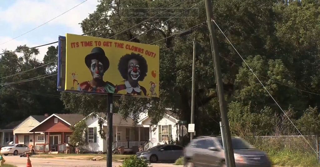 A billboard in Montgomery, Alabama, has ignited a storm of backlash after displaying the words “It’s Time to Get the Clowns Out!” alongside images of people in racist blackface, all framed in the branding of Donald Trump’s “Make America Great Again” slogan.