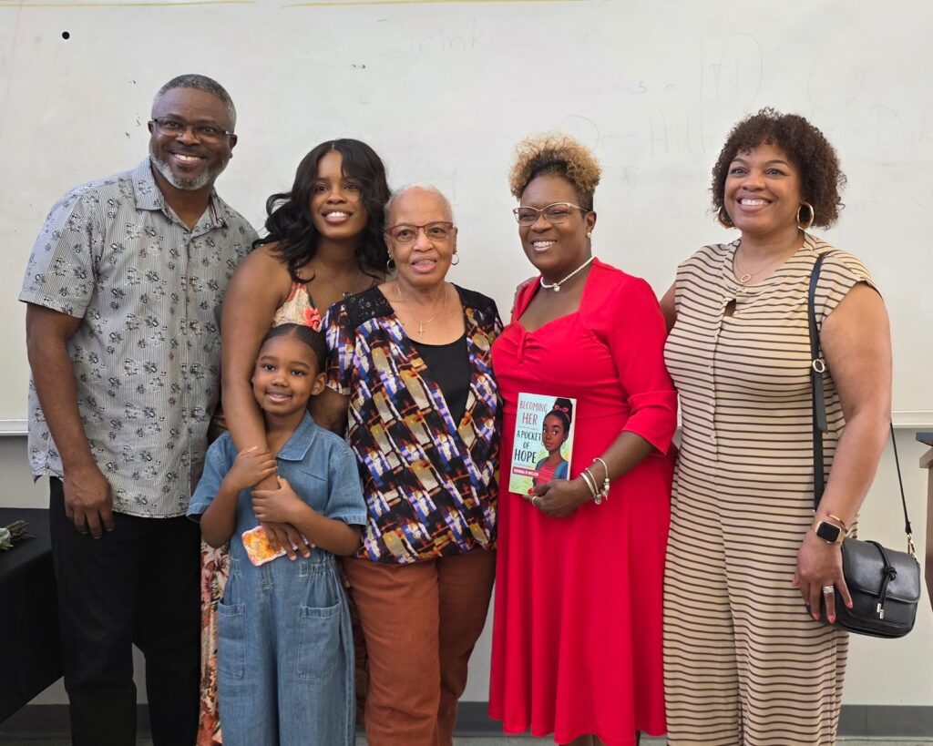 Author Donna Welch (third in line) stands with her husband, Mayor Ken Welch (first in line), family, and friends, holding her novel. All photos by Isis Climes