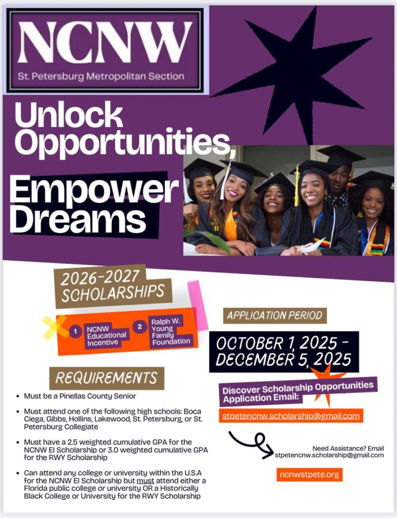 HomeOpportunitiesNCNW Educational Incentive and Ralph W. Young Family Foundation scholarships Opportunities NCNW Educational Incentive and Ralph W. Young Family Foundation scholarships By Staff Editor FacebookInstagramLinkedinTikTokYoutube October 31, 2025 Click here for more information. Top Event Most Popular City to excavate potential graves at Tropicana Field March 6, 2026 ‘Absurdity:’ Florida city officials denounce anti-DEI legislation March 5, 2026 Powerful Young Adults Skymaster Program offers access to aviation and AI careers March 5, 2026 Tampa nonprofit rescues St. Pete church group from Israel March 5, 2026 Load more