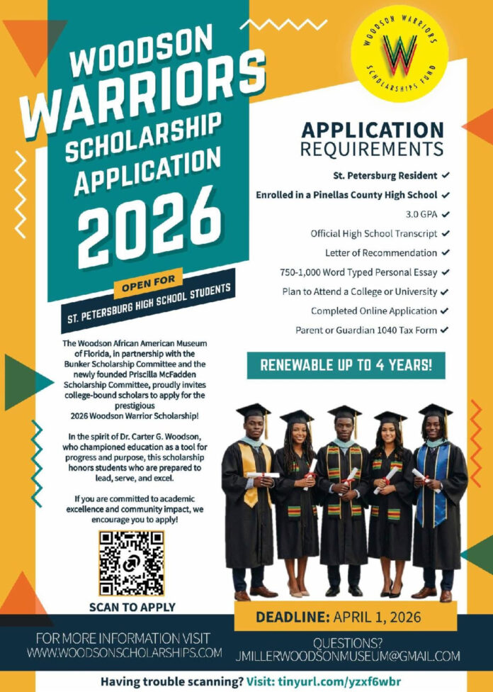 The Woodson African American Museum of Florida, in partnership with the Bunker Scholarship Committee and the newly founded Priscilla McFadden Scholarship Committee, proudly invites college-bound scholars to apply for the prestigious 2026 Woodson Warrior Scholarship!