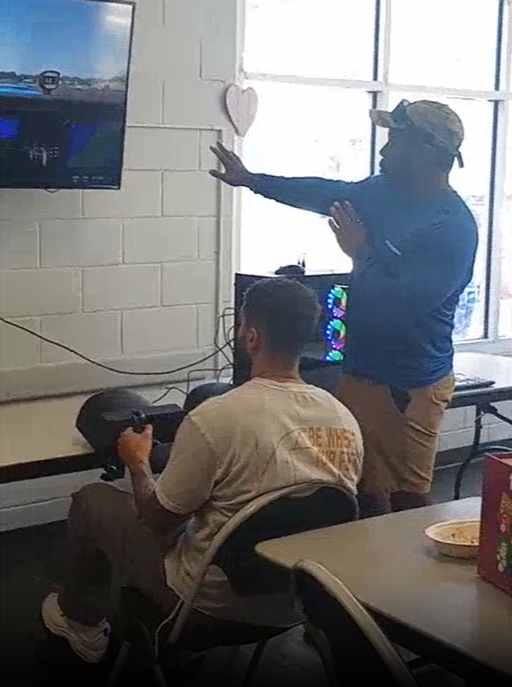 Instructor Earl Johnson guides a student through the fundamentals of drone flight during a Skymaster Program training session at the North Greenwood Aquatic Center in Clearwater. Participants receive hands-on instruction using industry-standard DJI drones while learning the principles of safe and responsible flight. The program introduces youth and transitioning adults to aviation concepts while preparing them for FAA drone certification and future career opportunities. Image retrieved from PYA Inc website.