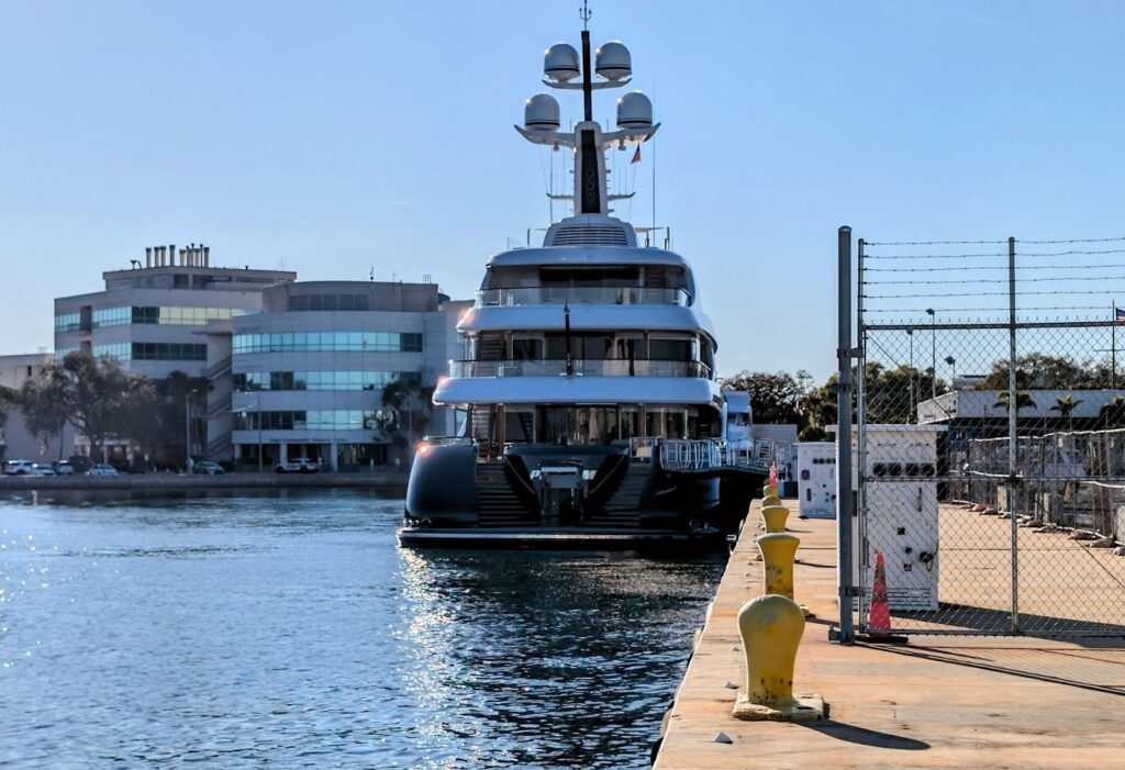 The Center for Coastal Resilience would replace an underutilized parking lot, which is temporarily housing a yacht, at Port St. Petersburg. USF’s College of Marine Science (background) has advocated for the facility. Photos by Mark Parker.