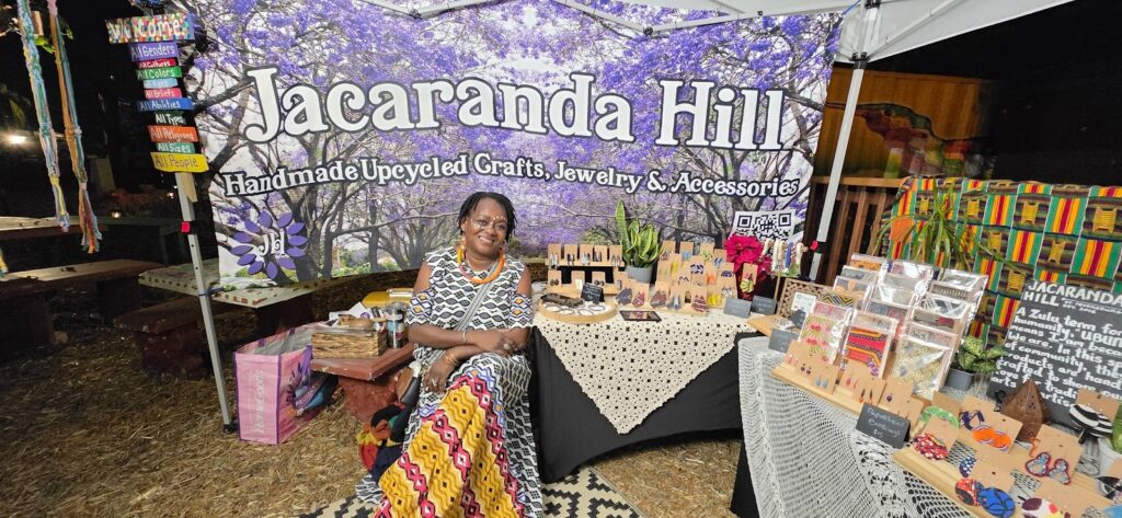 Photo by Isis Climes: Pippa Mpunzwana sitting in front of her stall
